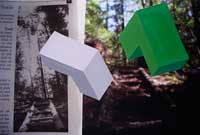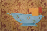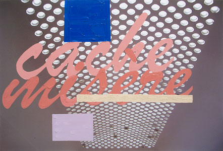 cache-misère is the title of a series of colour photographs on which we paint images, text and swatches of colour. Our photographs and painted images record places, events and objects we come across in the course of our daily activities. The photographs are compositionally completed by the addition of painted elements that, to varying degrees, obscure the underlying picture. The painted images most often represent domestic bric-a-brac painted either from observation in the manner of a traditional still life or copied from illustrations. Our painted photographs are no longer seamless windows onto reality, but assume a new logic where any editorial narrative is complemented by the associative synergy found in abstract painting.