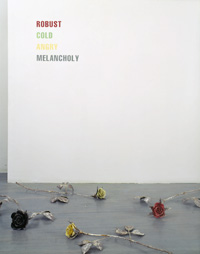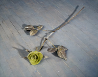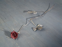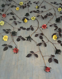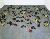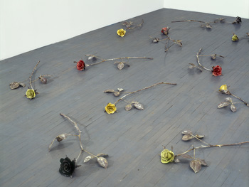 The Ideal Person or an Equal Mixture of the Four: Blood, Phlegm, Choler, and Melancholy (1997/98) The cut roses in both of these sculptures are made of glazed, hand-built porcelain that is then attached to individually sculpted sepals, stems and leaves made of other materials. In A Picture of Perfect Health (1997/98), the installation comprises 23 porcelain, wood and wax roses that densely cover the floor of an entire gallery. In The Ideal Person or an Equal Mixture of the Four: Blood, Phlegm, Choler, and Melancholy (1997/98), 23 glazed porcelain and bronze cut roses are scattered in a loose pattern on the floor to allow the viewer room to easily walk around the sculptures. In each installation, the presentation of so many sculptural flowers in a tangle on the floor of the gallery suggests a garden environment, or perhaps that a celebration or even a funeral rite (ceramic roses are commonly left on graves in Europe) has just taken place. The presence of porcelain at ground level hints at vulnerability and may lead viewers to take careful stock of their progress through the installation. Like the hands on a clock, here viewers move with precision and delicacy. The porcelain roses are glazed red, green, yellow or black; the colours are a decorative gesture while making a humourous reference to the four ancient humours or moods each represented by a bodily fluid. In ancient physiology whose doctrines remained current into 18th-century Europe the cardinal humours were: blood (red) = happiness or robustness; phlegm (green) = sluggishness or coldness; choler or yellow bile (yellow) = anger; and melancholy or black bile (black) = depression. Medical practitioners believed that a healthy and balanced person had an equal mixture of the four. In the installations, a reference to each of the four humours is signpainted on the wall in the roses’ four colours. porcelain and bronze, or porcelain, wood and wax Read poems by Jill Battson from the Sanguine exhibition catalogue |