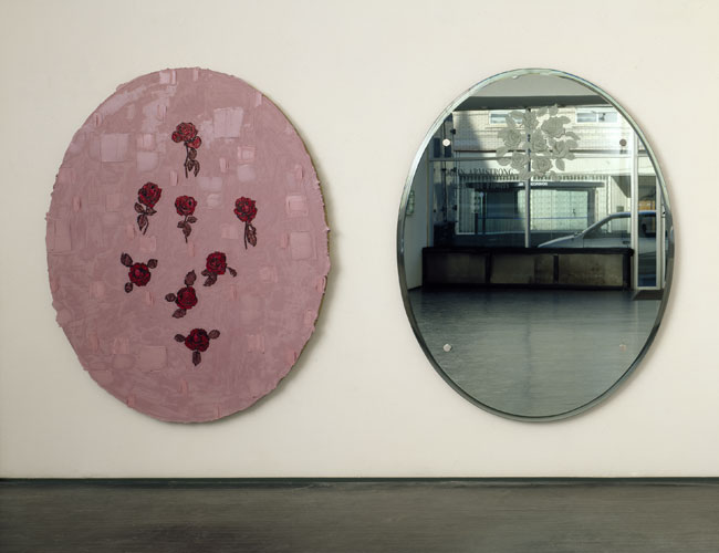 left panel: oil on linen right panel: sandcarved glass each panel: 162 x 132 cm