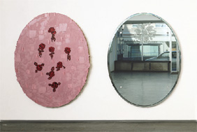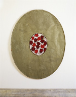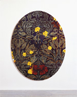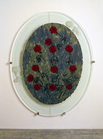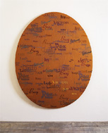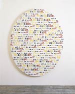 In 1991, I began to work on oval-format paintings: smaller-scaled paintings (47 x 56 cm) with a longer horizontal axis, and larger ones (162 x 132 cm) on the vertical axis. The oval format was used historically in conjunction with portraiture. Perhaps the portrait format was a substitute for the personalized product names I had previously used in my paintings. I used fewer elements in the oval paintings, and distributed a diversity of sources across several pieces in an exhibition. The oval paintings indvidually feature text, roses, or an ersatz abstract ground. And pattern is emphasized; for example, the same snippet of text is used repeatedly in one painting to form a kind of chant or visual mantra. (The texts are popular maxims or adages that characterize (and even complain about) busy-ness and the fleeting nature of time, such as "Busy as a fart in a mitt" or "I am not an eight-day clock.") I painted both in oil on linen, and on a number of other supports: photographs, sandcarved glass mirrors, bubble wrap, cardboard, and stacked-up-and-stitched-together billboard posters. The juxtaposition of visibly crafted components such as the pairing of sandcarved glass roses in a large mirror with a painting of roses of a similar shape and scale contextualizes painting within traditions of craft, skewing painting’s sometimes burdensome relationship to the canon of Western art history. Read poems by Jill Battson from the Sanguine exhibition catalogue Read a poem by Gary Michael Dault from the Sanguine exhibition catalogue Read an essay by Gordon Hatt from the Sanguine exhibition catalogue Read an essay by Lisa Gabriel Mark from the Sanguine exhibition catalogue |