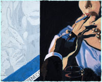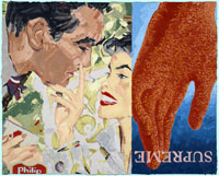 Smokin' recreates the painted illustrations for cigarette advertising that appeared (or could very well have appeared) in glossy lifestyle magazines of the 1950s and 60s such as The Saturday Evening Post, Life, Redbook, and Paris Match. In many of the paintings, I depict a man and a woman smoking together in a variety of picturesque and intimate settings: couples pause in a wooded glade with a waterfall backdrop, dine in an elegant restaurant, relax in bed. The rituals of smoking are suggested in a number of unconsciously choreographed (and socially conditioned) studies of the smokers' hand gestures: he lights her cigarette; she takes his cigarette from his mouth; she caresses his hand while he holds his cigarette off to one side. In each painting, I echo the central image of smokers by painting domestic bric-a-brac and natural still-life motifs, such as household rubber gloves, clothespins, fish on a line, and reflections on the surface of water.