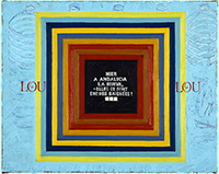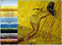 From 1989 on, my small oil paintings depicted men and women in traditional gender roles. The canvases were often divided into two panels, one side containing a rubber-gloved woman’s hand involved in household cleaning, and the other side containing men and women engaged in various leisure activities, such as holiday making. The depiction of vacation culture sailing, the beach, fishing is a well-established genre in Western art from Impressionism on. Although the precedent may be Impressionism, these paintings more immediately based on magazine illustrations of the 1950s and 60s. I attempted to paint in a number of styles that might evoke not only recent art history but also techniques that might have been used by commercial artists. Advertising and marketing was further emphasized by the inclusion of product names (lingerie or marine outboard motor manufacturers, to name two). The product names appeared in their characteristic typeface, but were truncated to create a first name: for example, Kent cigarettes appears as Ken or Evinrude Motors as Evan. If the product name was already a first name, as in the case of the lingerie manufacturers Lou or Celia, they would appear in their entirety. As in the previous series, there is a strong element of play involved in both the purposeful free association of visual elements and in the careful manufacture of the painted surfaces.